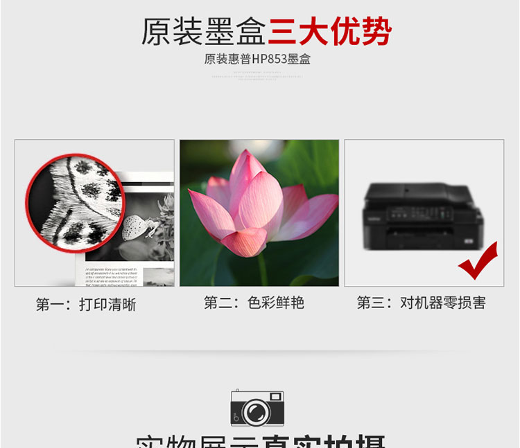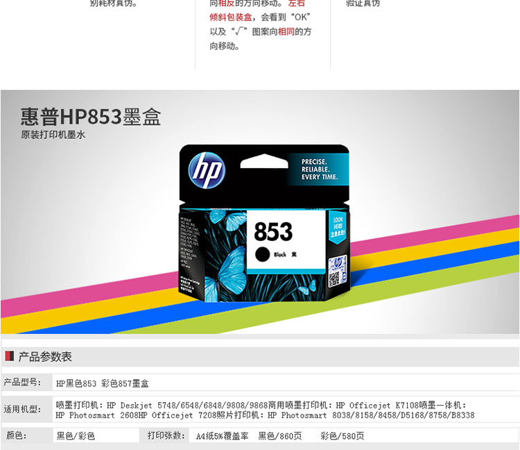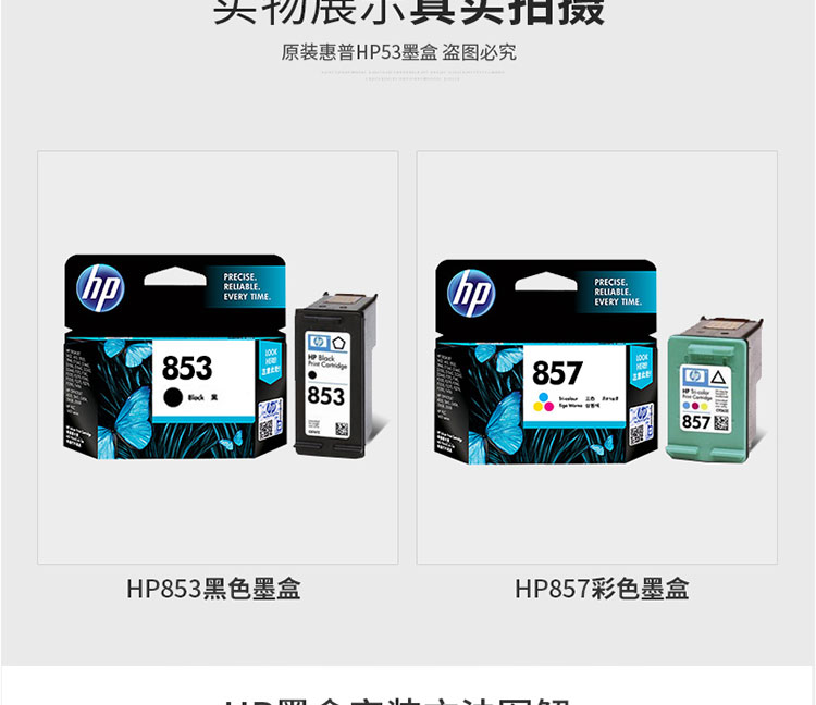 颜色:惠普857彩色墨盒/560页(A4纸5%覆盖面积),惠普853黑色墨盒/860页(A4纸5%覆盖面积)