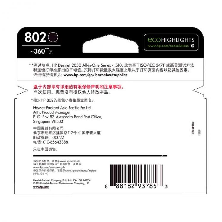 (大)HP 802(黑色)+(彩色)墨盒CR312AA