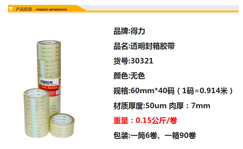 得力30321(超透)封箱胶带60mm*40y