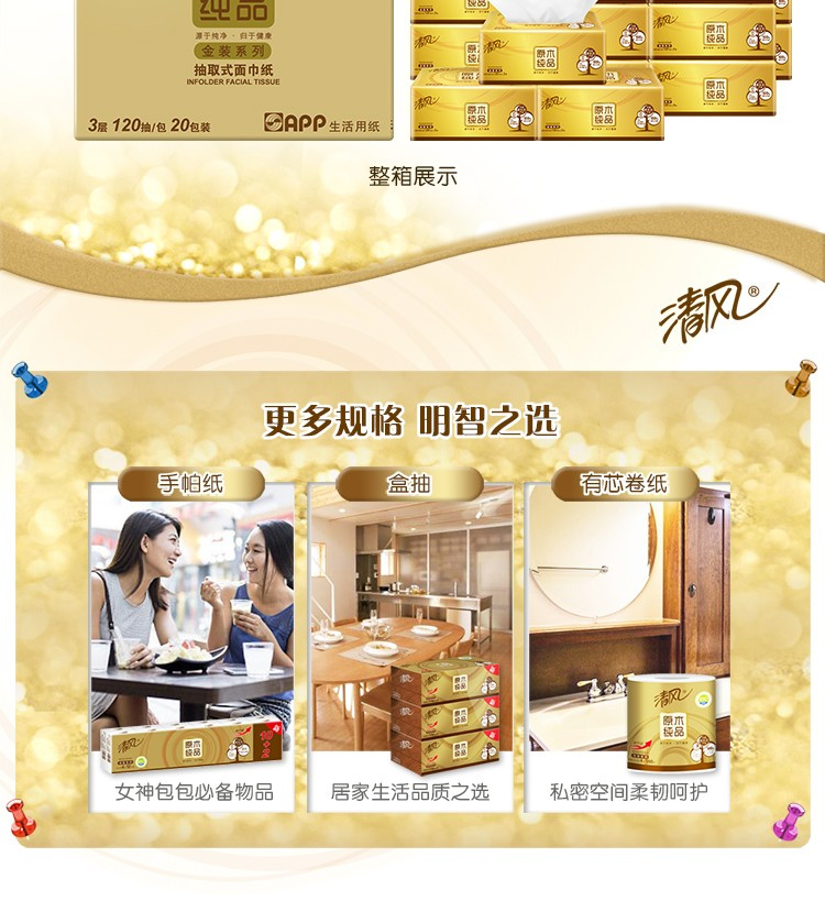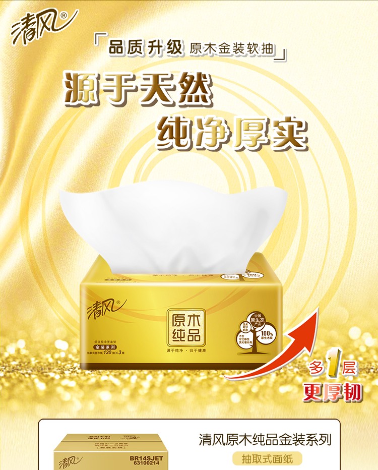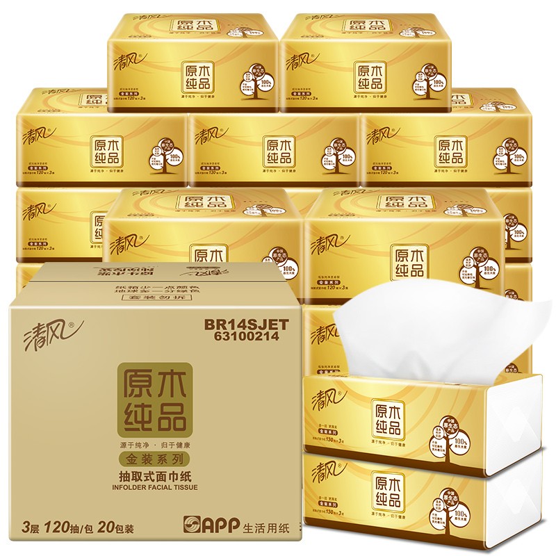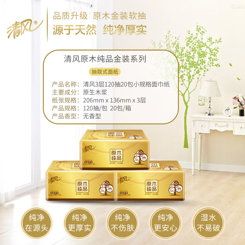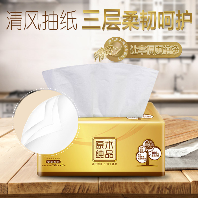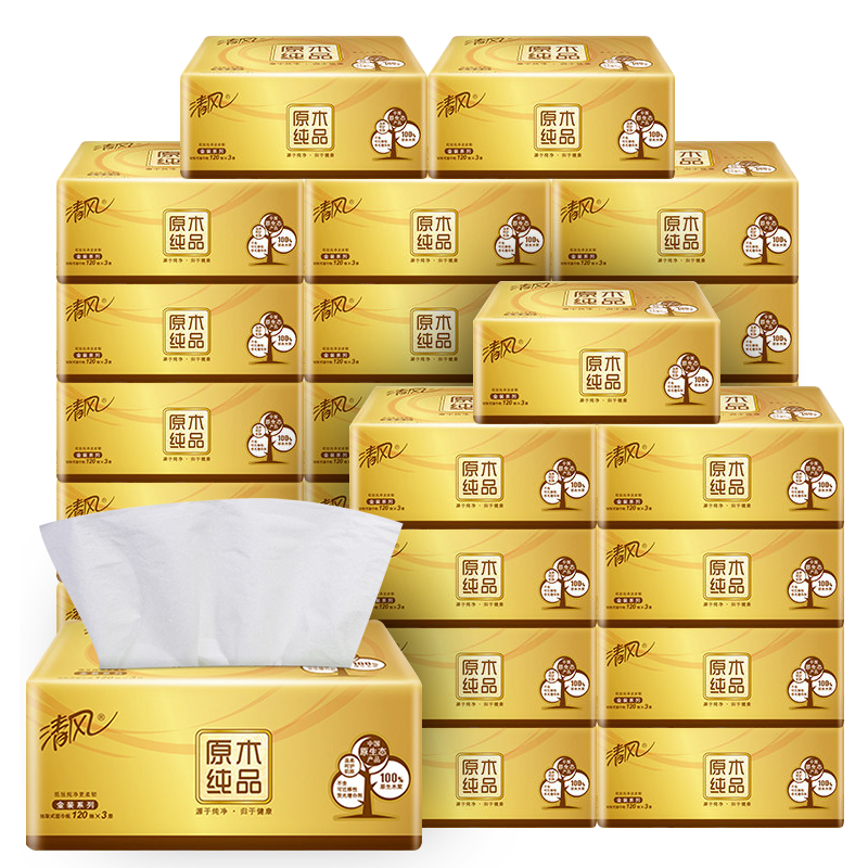 清风抽纸巾金装原木整箱20包120抽3层纸巾餐巾纸家用卫生纸...