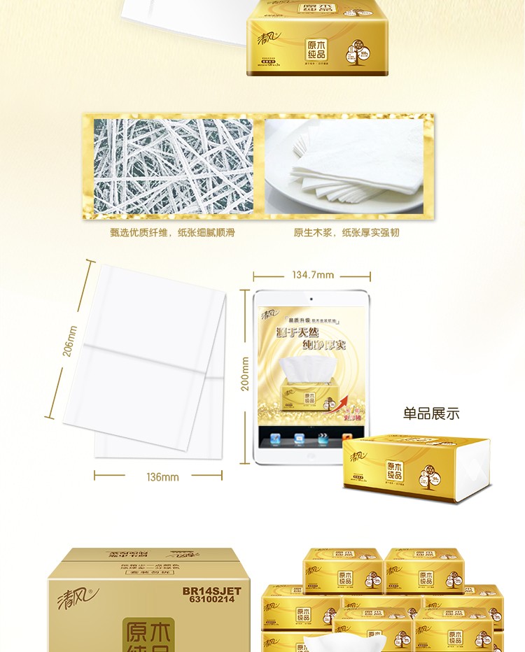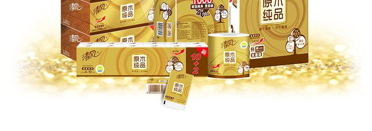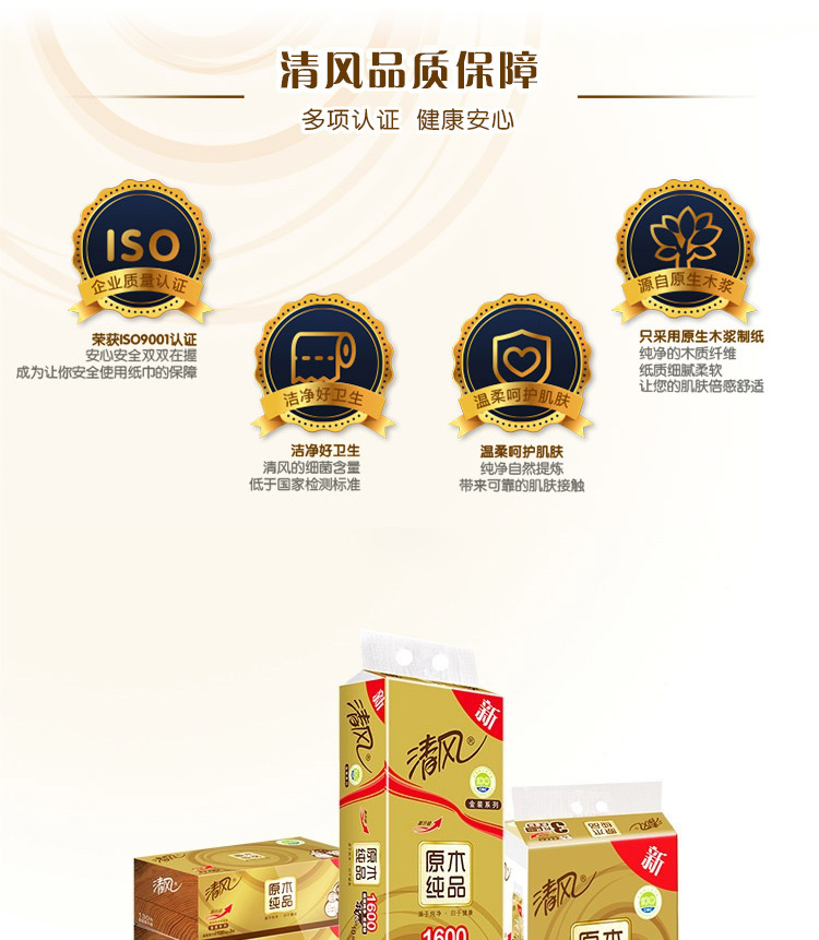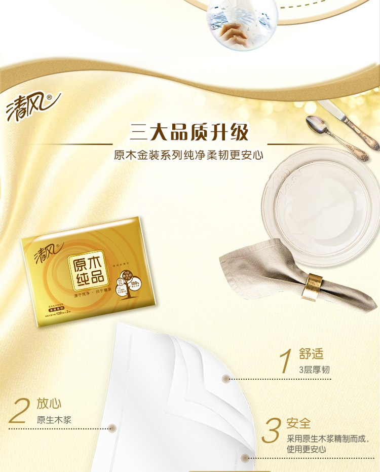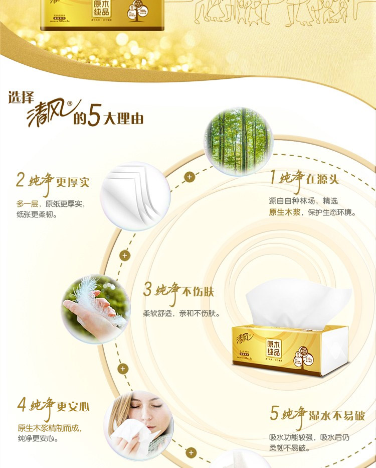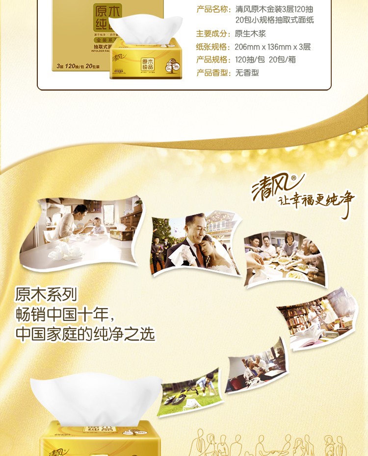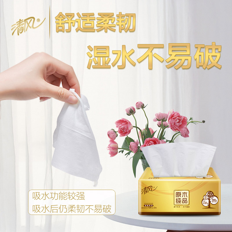 清风抽纸巾金装原木整箱20包120抽3层纸巾餐巾纸家用卫生纸...