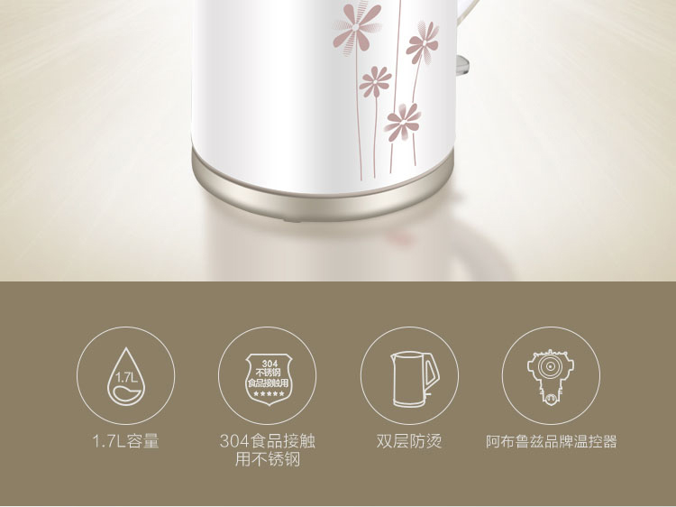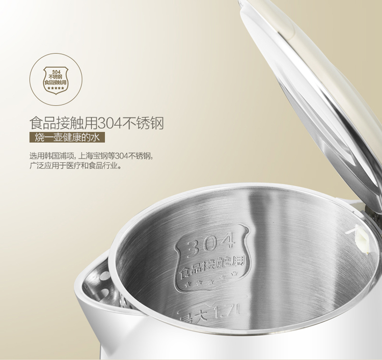 | 产品名称 : | 美的电水壶WH517E2b 304不锈钢电热水壶 1.7L容量 无缝一体内胆 双层防烫烧水壶(白玉) |
