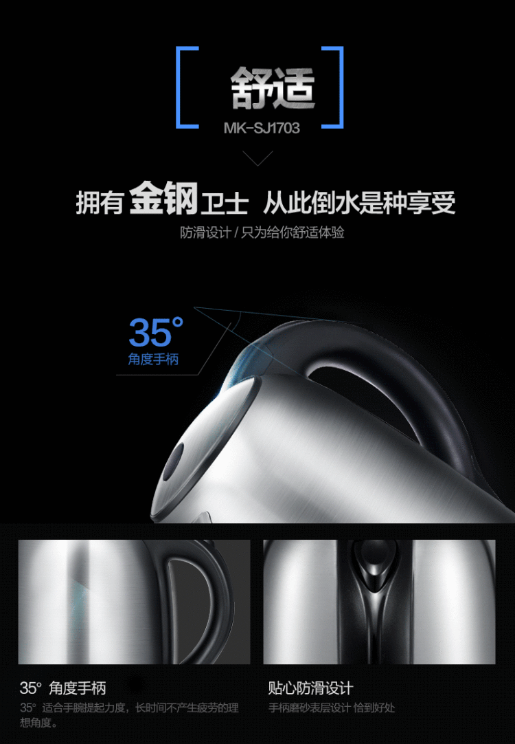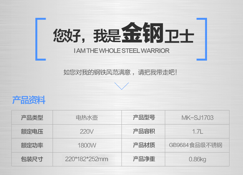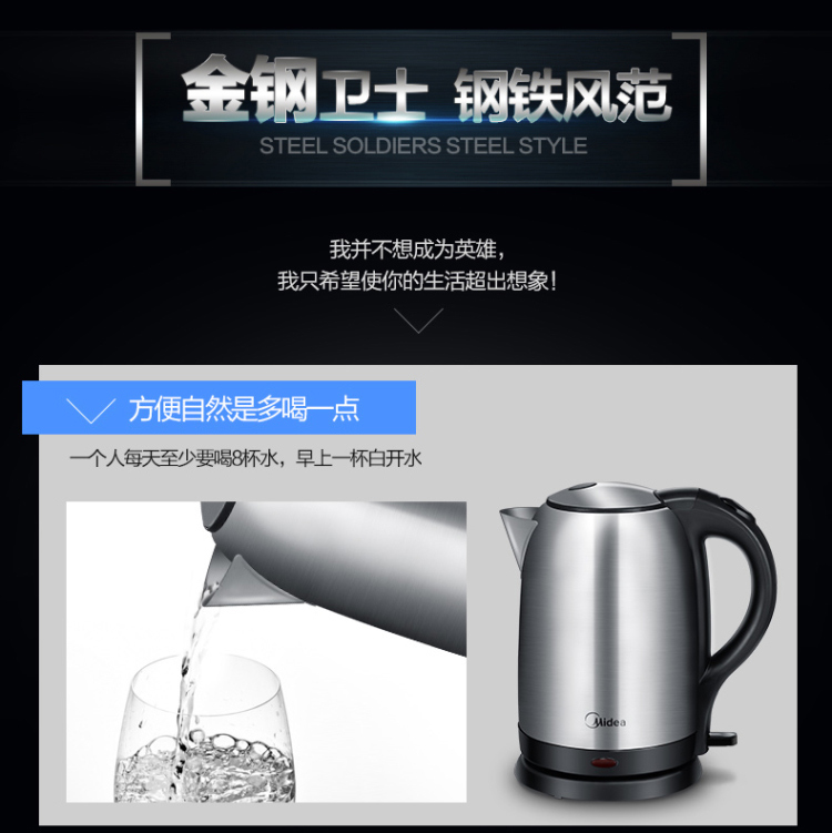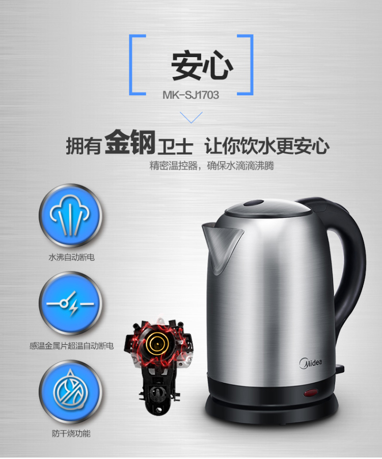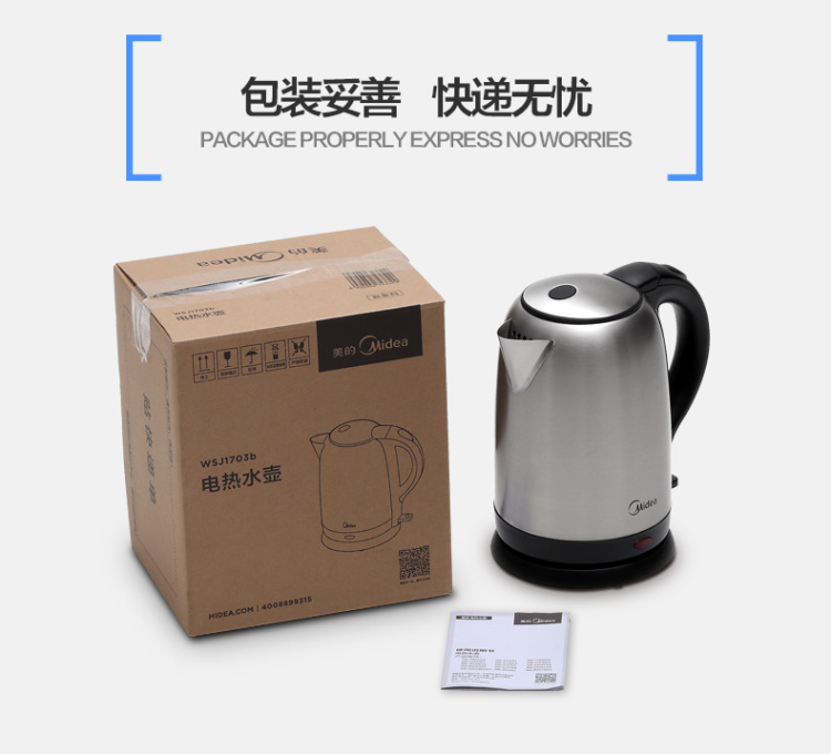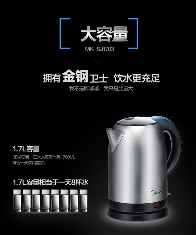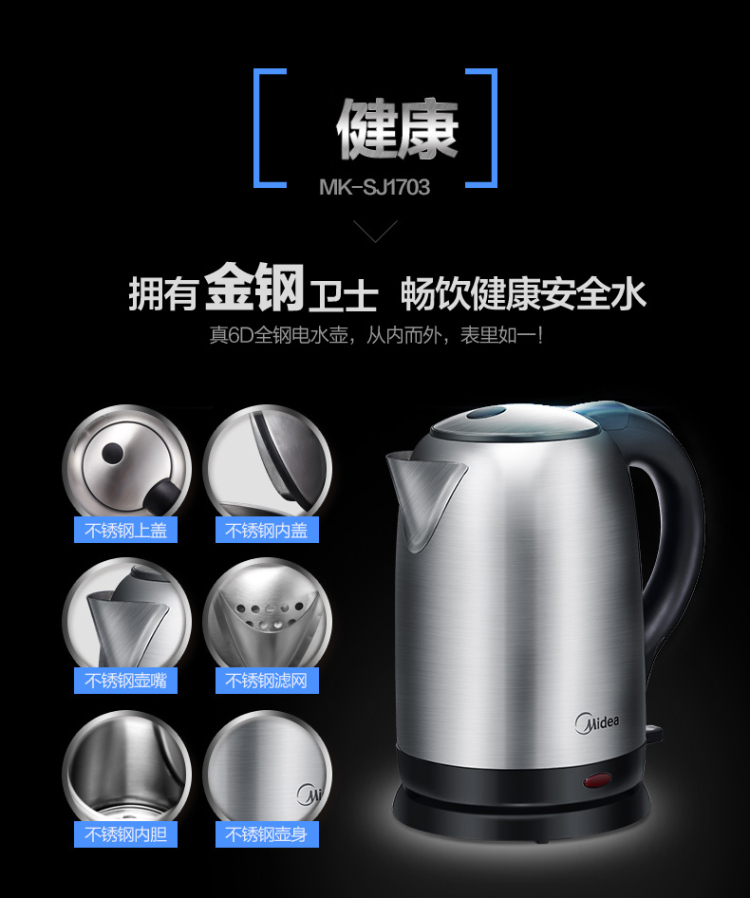 | 产品名称 : | 美的电水壶WSJ1703b 304不锈钢电热水壶 1.7L容量 6D全钢烧水壶 |