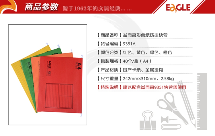 益而高9351A A4挂快劳 吊挂快劳夹 40个/盒颜色随机