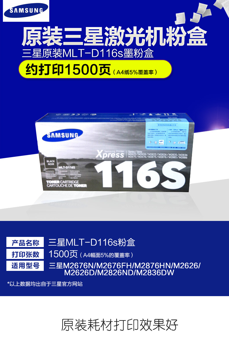 颜色:小容量D116S粉盒/1500页(A4纸5%覆盖面积)